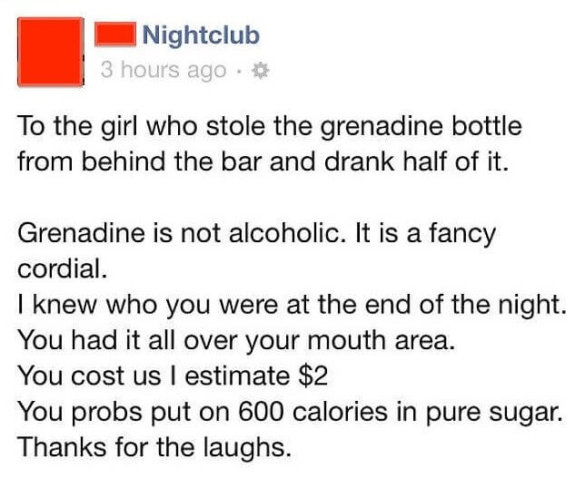 Everyone in the club could instantly spot her as the grenadine thief. Imagine the embarrassment of stealing something, only to find out it’s not what you thought! Grenadine is a common bar ingredient, but it’s definitely not something you’d drink straight. This situation serves as a funny yet cautionary tale about thinking twice before making impulsive decisions. After all, why risk trouble for something that doesn’t even give you a buzz? Stealing is never worth it, and this girl’s sticky, red-faced moment proves it.
